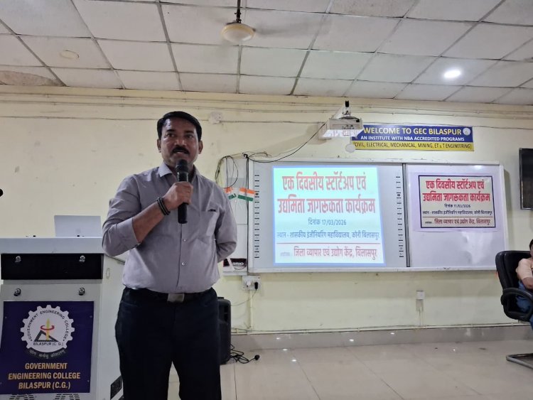 बिलासपुर : युवाओं को आत्मनिर्भरता और नवाचार की दिशा में अग्रसर करने के उद्देश्य से शासकीय इंजीनियरिंग महाविद्यालय, कोनी में एक दिवसीय “स्टार्टअप एवं उद्यमिता जागरूकता कार्यक्रम” का सफल आयोजन किया गया। कार्यक्रम जिला व्यापार एवं उद्योग केंद्र, बिलासपुर द्वारा उद्योग संचालनालय के अपर संचालक श्री संजय गजघाटे की अध्यक्षता में आयोजित हुआ।
