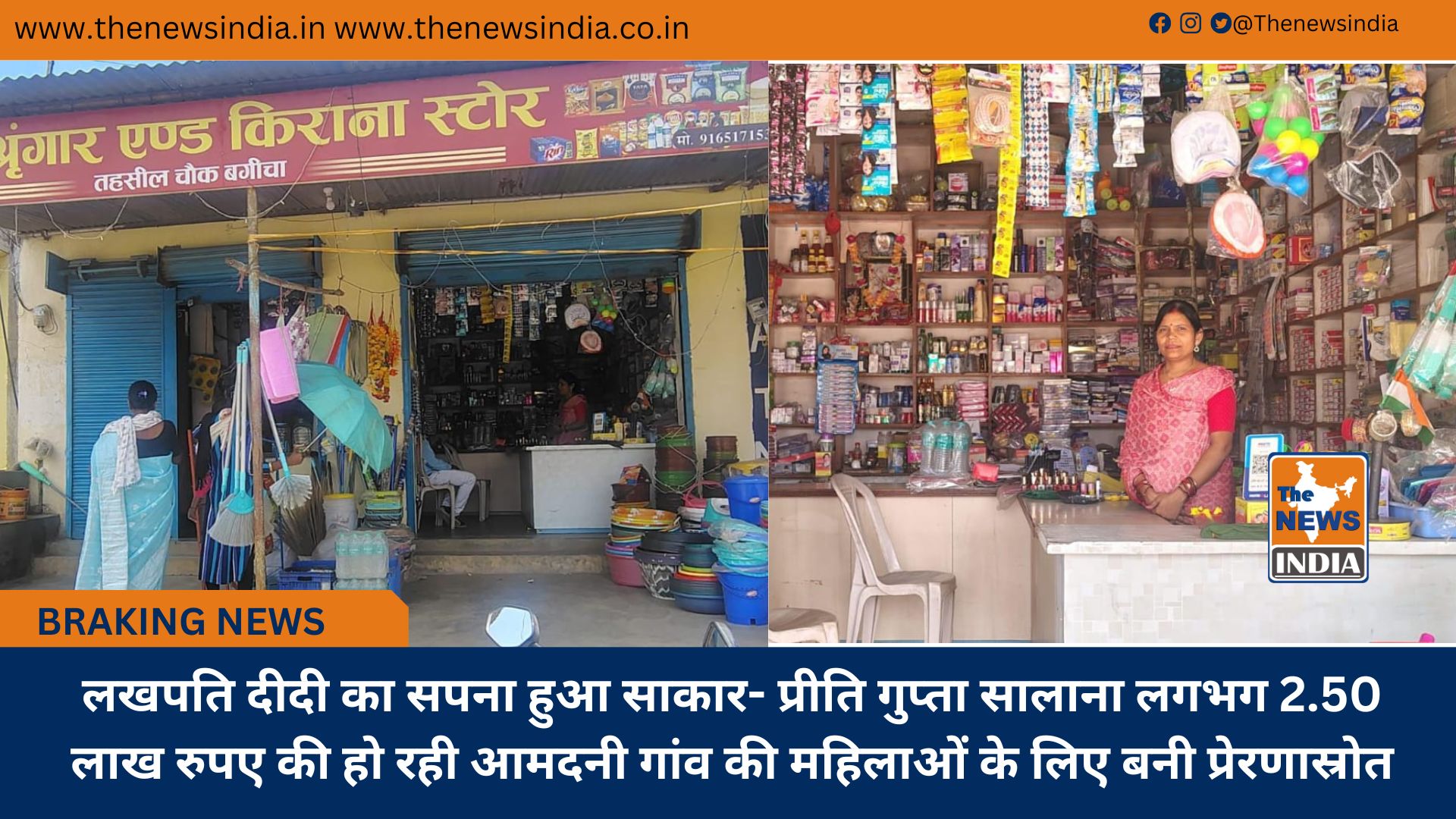 जशपुर जिले के विकासखंड बगीचा के ग्राम बुढाडांड की रहने वाली प्रीति गुप्ता ने मुद्रा लोन लेकर दुर्गा श्रृंगार एवं किराना दुकान की शुरुआत की। प्रारंभ में छोटे स्तर पर दुकान संचालित करने वाली प्रीति ने धीरे-धीरे ग्राहकों की जरूरतों को समझते हुए दुकान का विस्तार करती जा रही है। आज उनकी दुकान गांव की प्रमुख दुकानों में गिनी जाती है। सौंदर्य प्रसाधन से लेकर हर जरूरत का सामान उनकी दुकान में उपलब्ध है। मुद्रा लोन से मिली आर्थिक सहायता एवं मेहनत और लगन का ही परिणाम है कि आज वे प्रतिवर्ष लगभग 2.50 लाख का शुद्ध लाभ कमा रही हैं। उन्होंने अपने आत्मविश्वास, परिश्रम और बिहान योजना के सहयोग से लखपति दीदी बनने का सपना साकार किया है।