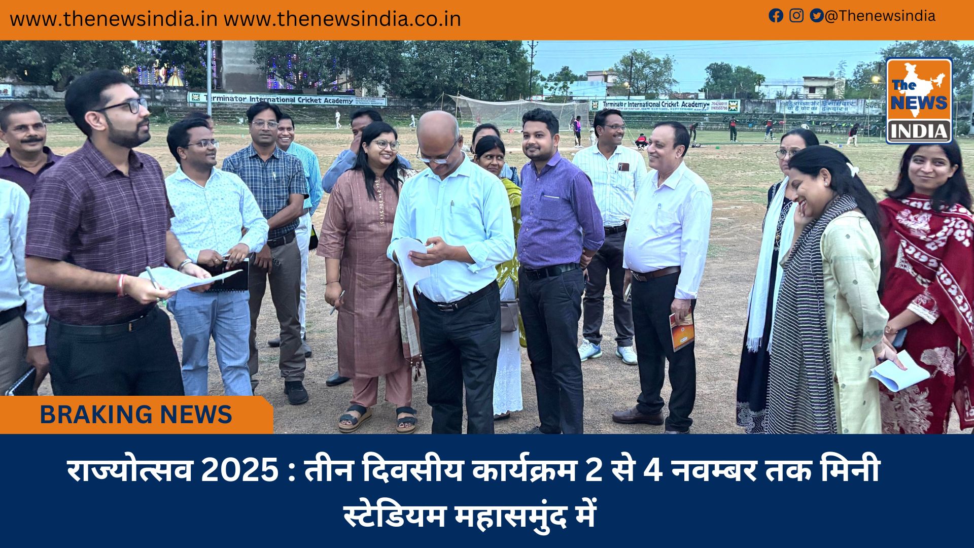 महासमुन्द : छत्तीसगढ़ शासन से प्राप्त निर्देशानुसार विगत वर्षों की भांति इस वर्ष भी छत्तीसगढ़ स्थापना दिवस के अवसर पर राज्योत्सव 2025 का आयोजन जिला मुख्यालय महासमुन्द में भव्य रूप से किया जाएगा। यह तीन दिवसीय कार्यक्रम 02 नवम्बर से 04 नवम्बर 2025 तक मिनी स्टेडियम, शासकीय महाप्रभु वल्लभाचार्य महाविद्यालय में आयोजित होगा। कलेक्टर श्री विनय कुमार लंगेह एवं जिला अधिकारियों ने आज शाम मिनी स्टेडियम पहुंचकर तैयारियों का जायजा लिया।