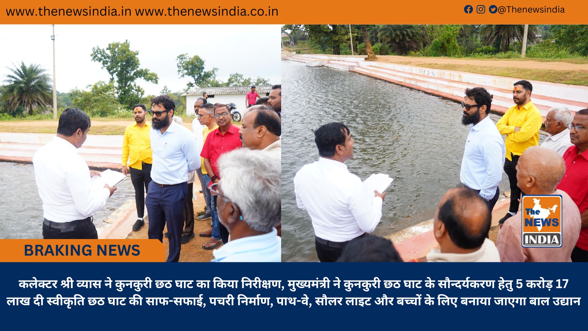 कलेक्टर श्री व्यास ने कुनकुरी छठ घाट का किया निरीक्षण, मुख्यमंत्री ने कुनकुरी छठ घाट के सौन्दर्यकरण हेतु 5 करोड़ 17 लाख दी स्वीकृति छठ घाट की साफ-सफाई, पचरी निर्माण, पाथ-वे, सौलर लाइट और बच्चों के लिए बनाया जाएगा बाल उद्यान