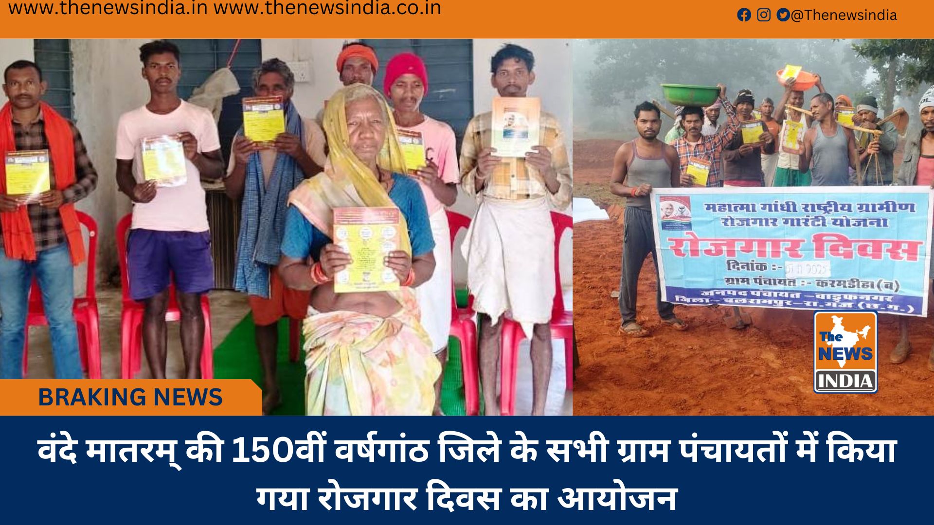 बलरामपुर : कलेक्टर श्री राजेन्द्र कटारा के निर्देशन एवं जिला पंचायत सीईओ श्रीमती नयनतारा सिंह तोमर के मार्गदर्शन में वंदे मातरम् की 150 वीं वर्षगांठ के अवसर पर जिले के सभी ग्राम पंचायतों में रोजगार दिवस मनाया गया। जिसके अन्तर्गत सभी 476 ग्राम पंचायतों में महात्मा गांधी नरेगा योजना अंतर्गत रोजगार दिवस का आयोजन कर ई-केवाईसी, प्रधानमंत्री आवास के संबंध में जानकारी दी गई।