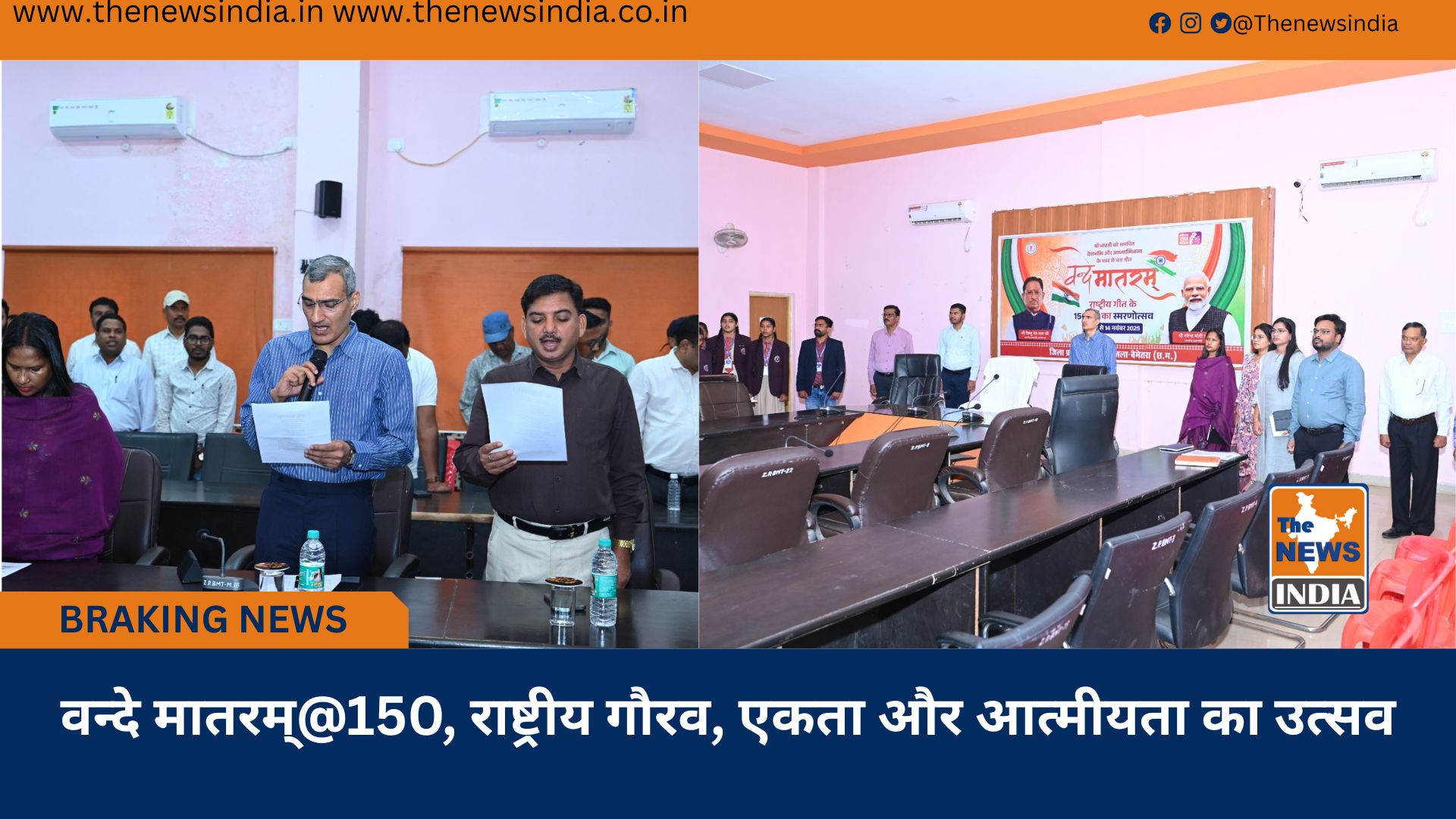 वन्दे मातरम् की 150वीं वर्षगांठ पर पूरे जिले में सभी शैक्षणिक संस्थानों समस्त ग्राम पंचायतों सभी नगरीय निकायों सभी शासकीय कार्यालयों में एक साथ सामूहिक राष्ट्रीय गीत का आयोजन कर बेमेतरा ने देश के प्रति अपनी एकता, प्रेम और श्रद्धा का अद्भुत संदेश दिया। आज का स्मरणोत्सव सिर्फ एक कार्यक्रम नहीं, बल्कि भारतीय अस्मिता, राष्ट्रीय चेतना और एकता के अद्वितीय प्रतीक वन्दे मातरम् के प्रति सम्मान का सच्चा अवसर था। पूरे जिले ने एक स्वर में संदेश दिया वन्दे मातरम् केवल गीत नहीं, हमारी राष्ट्रीय आत्मा की धड़कन है।