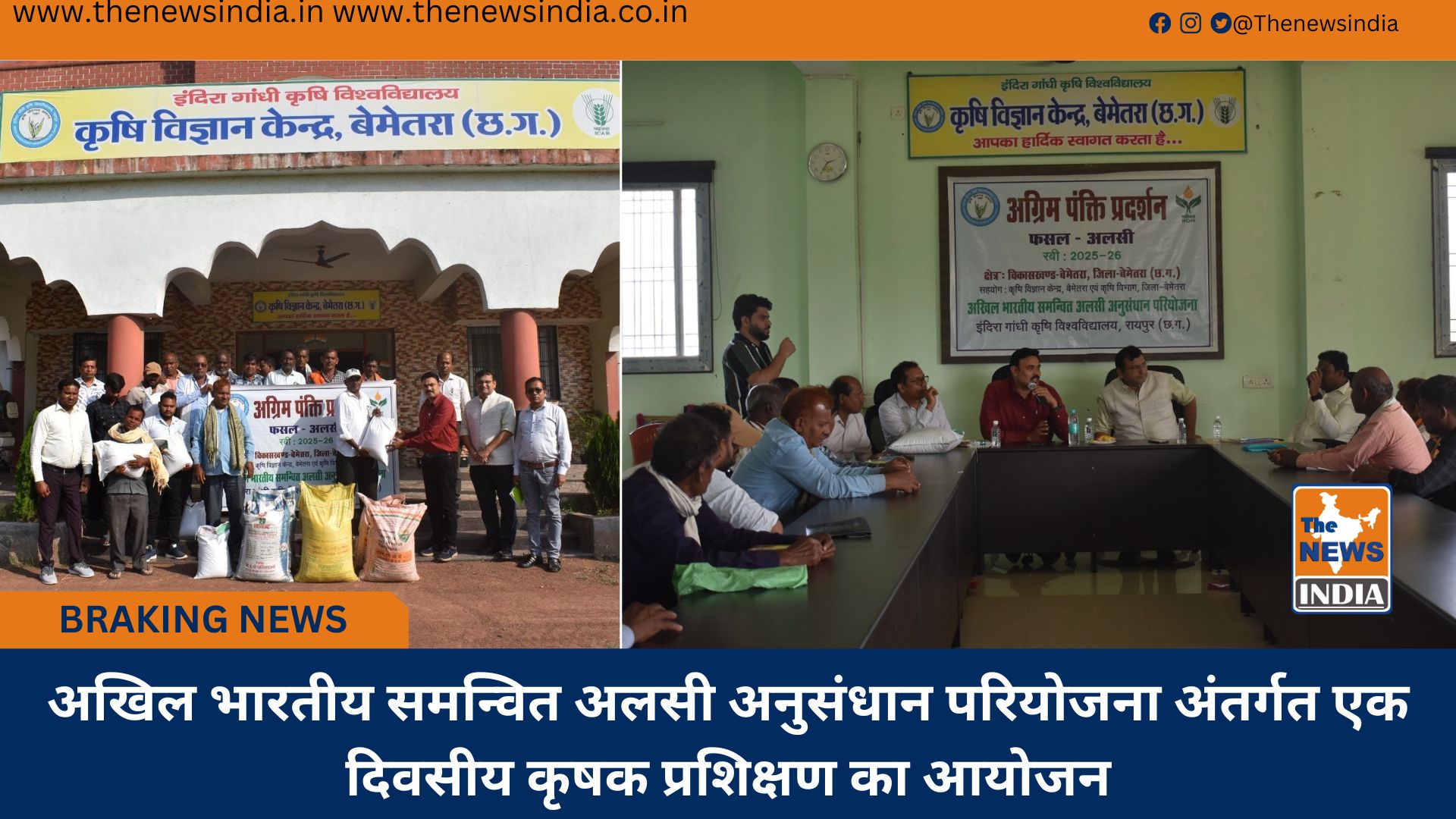 बेमेतरा : अखिल भारतीय समन्वित अलसी अनुसंधान परियोजना, इंदिरा गांधी कृषि विश्वविद्यालय, रायपुर के तत्वाधान में जिला बेमेतरा में अलसी फसल की अग्रिम पंक्ति प्रदर्शन अंतर्गत कृषक प्रशिक्षण सह आदान सामग्री वितरण कार्यक्रम का आयोजन आज 07 नवंबर 2025 को कृषि विज्ञान केन्द्र, बेमेतरा के सभागार में किया गया। इस कार्यक्रम में डॉ. संदीप भंडारकर, अधिष्ठाता, रेवेन्द्र सिंह वर्मा कृषि महाविद्यालय एवं अनुसंधान केन्द्र, ढोलिया ने देश में तिलहनी फसल के महत्व एवं संभावना के बारे में प्रकाश डालते हुए तिलहनी फसल का क्षेत्रफल बढ़ाने के लिए किसानों को प्रोत्साहित किया साथ ही कृषि महाविद्यालय में स्थापित अलसी डंठल के रेशे से कपड़ा बनाने की इकाई के बारे में जानकारी दी। अखिल भारतीय समन्वित अलसी अनुसंधान परियोजना के प्रमुख वैज्ञानिक डॉ. संजय द्विवेदी ने परियोजना के उद्देश्य तथा किसानों को अलसी फसल की उन्नत कास्त तकनीक भूमी की तैयारी, बीज दर, बुआई, उर्वरक एवं जल मांग, खरपतवार नियंत्रण इत्यादि के बारे में विस्तृत रूप से जानकारी दिया एवं किसानों द्वारा प्रकट की गई तकनीकी जिज्ञासा का समाधान किया। कृषक वैज्ञानिक परिचर्चा के दौरान कृषि विज्ञान केन्द्र, बेमेतरा के वरिष्ठ वैज्ञानिक एवं प्रमुख तोषण कुमार ठाकुर एवं वैज्ञानिक डॉ. जितेन्द्र जोशी, श्री डोमन सिंह टेकाम ने किसानों को पौध संरक्षण, फार्म मेकेनाइजेशन एवं अलसी फसल के बीज उत्पादन कार्यक्रम के बारे में जानकारी साझा किया। इस कार्यक्रम में कृषि विभाग बेमेतरा के ग्रामीण कृषि विस्तार अधिकारी श्री राजेश कुमार टंडन का विशेष सहयोग रहा व विकासखंड बेमेतरा के ग्राम घठौली, आंदू खुड़मुड़ी के 20 हितग्राही किसानों की सहभागिता रही।