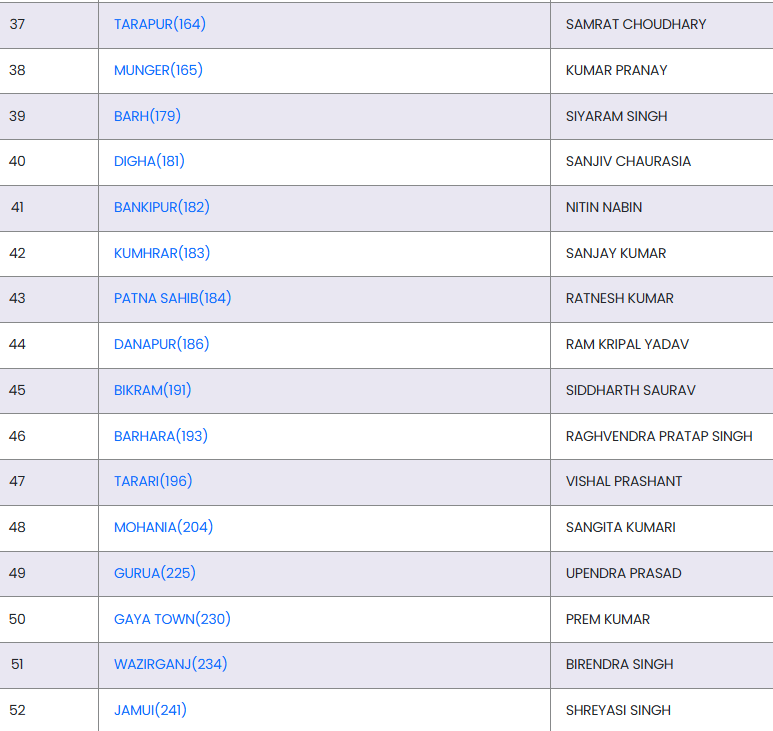 Bihar Election Results : बिहार चुनाव में NDA ने शानदार प्रदर्शन दिखाया है। इस चुनाव में भारतीय जनता पार्टी सबसे बड़ा दल साबित हुआ। खबर लिखे जाने तक भाजपा के 52 प्रत्यशी विजयी घोषित हो चुके हैं। वहीं 38 सीटों पर अभी भी बढ़त हासिल हैं।