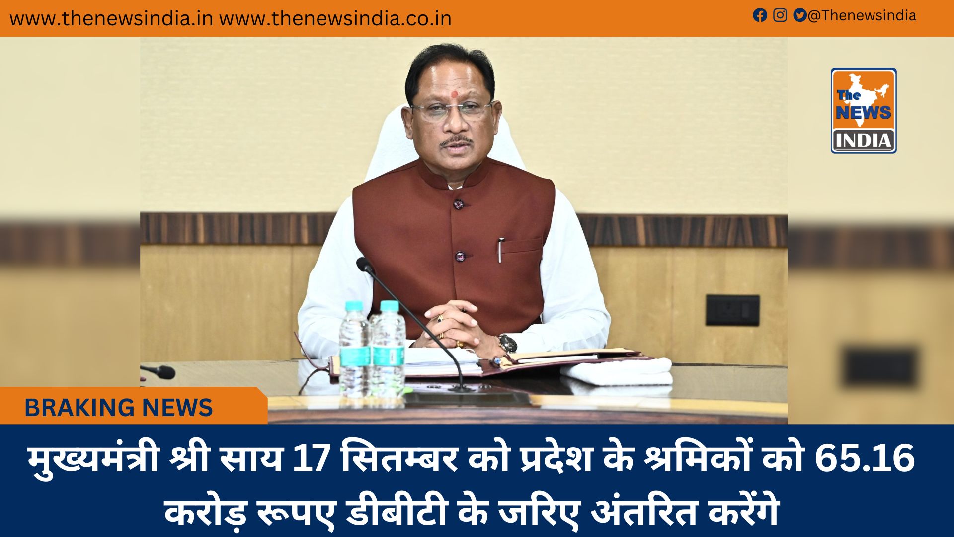मुख्यमंत्री श्री साय 17 सितम्बर को प्रदेश के श्रमिकों को 65.16 करोड़ रूपए डीबीटी के जरिए अंतरित करेंगे