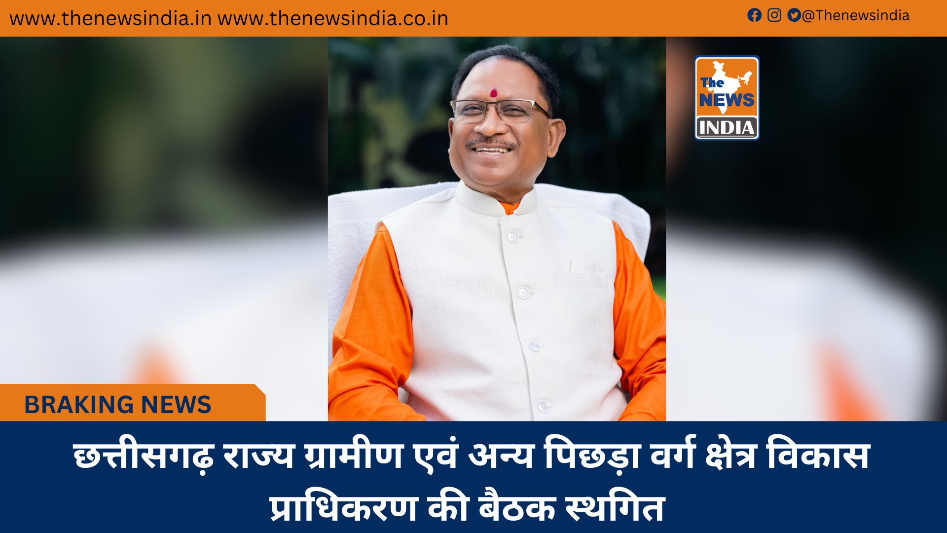 रायपुर : मुख्यमंत्री श्री विष्णु देव साय की अध्यक्षता में 19 सितंबर को दुर्ग में आयोजित होने वाली छत्तीसगढ़ राज्य ग्रामीण एवं अन्य पिछड़ा वर्ग क्षेत्र विकास प्राधिकरण की बैठक अपरिहार्य कारणों से स्थगित कर दी गई है। यह बैठक सुबह 11 बजे पी.डब्ल्यू.डी., मीटिंग हॉल, जी. ई. रोड, दुर्ग में आयोजित की जानी थी। प्राधिकरण की अगली बैठक की सूचना पृथक से दी जाएगी।