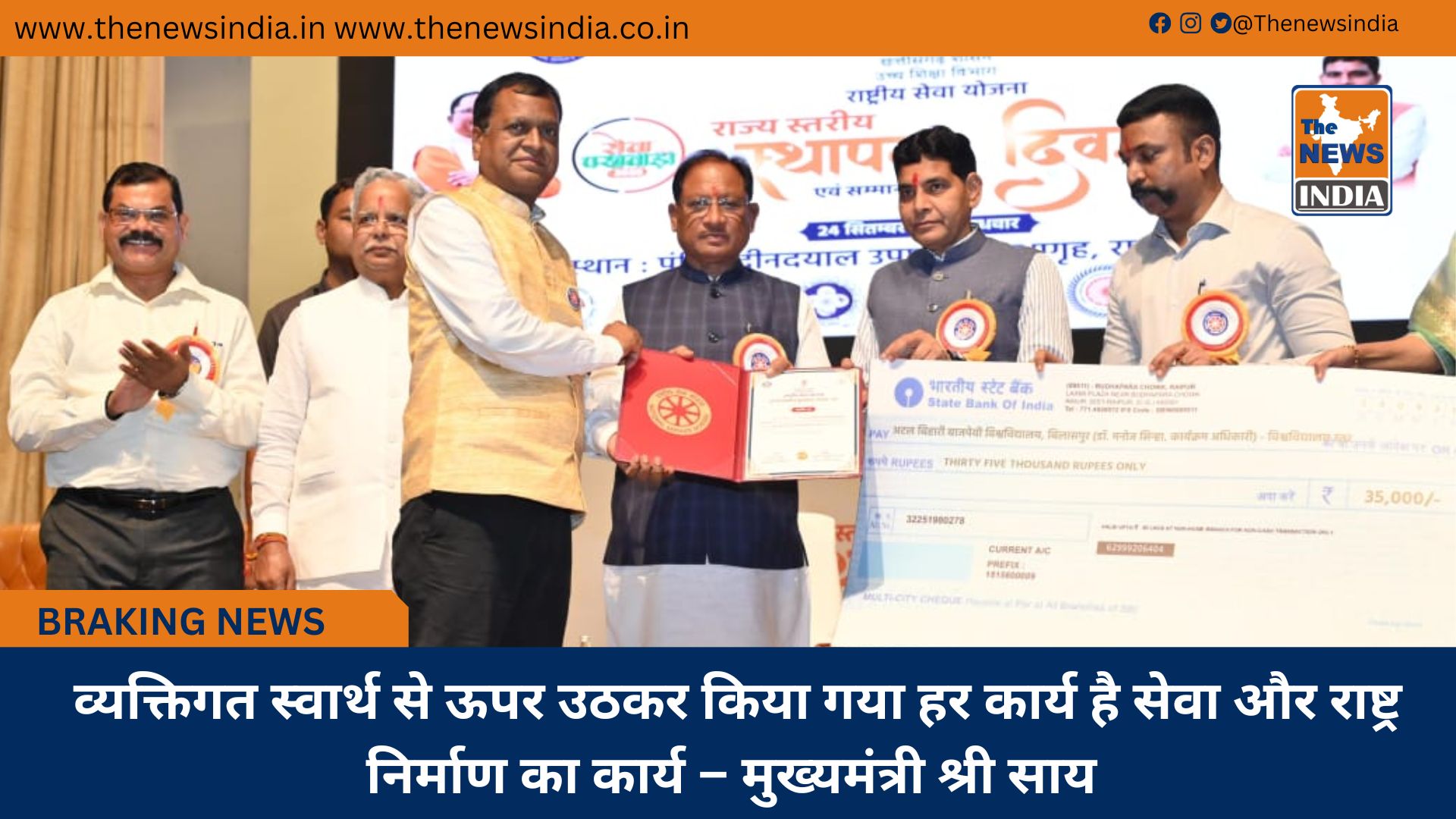 व्यक्तिगत स्वार्थ से ऊपर उठकर किया गया हर कार्य है सेवा और राष्ट्र निर्माण का कार्य – मुख्यमंत्री श्री साय