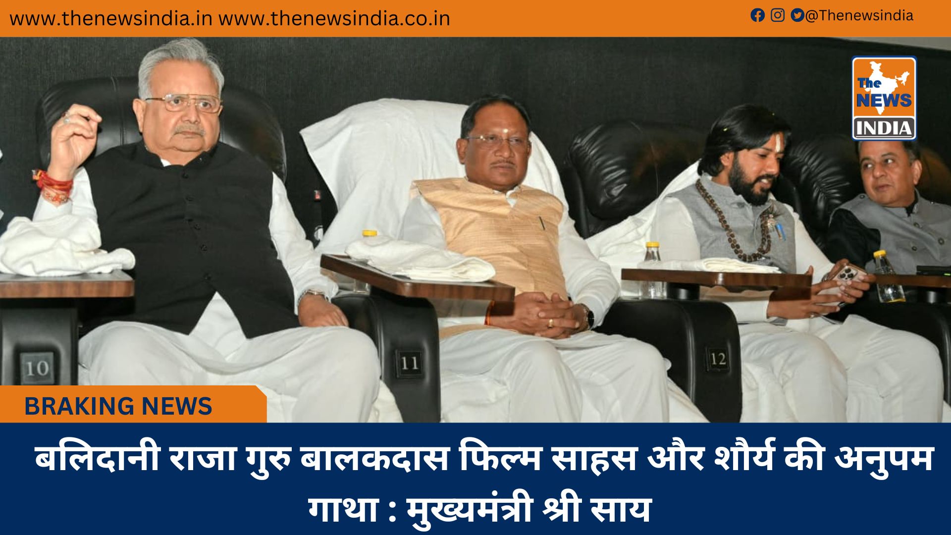 रायपुर : मुख्यमंत्री श्री विष्णु देव साय आज राजधानी रायपुर स्थित अंबुजा मॉल के सिनेमाघर में छत्तीसगढ़ी फिल्म “बलिदानी राजा गुरु बालकदास” को देखने पहुँचे। इस अवसर पर विधानसभा अध्यक्ष डॉ. रमन सिंह, कैबिनेट मंत्री गुरु खुशवंत साहेब, विधायक श्री डोमनलाल कोर्सेवाडा, विधायक श्री रोहित साहू, धर्मगुरु गुरु बालदास साहेब सहित अनेक जनप्रतिनिधि और सतनामी समाज के गणमान्य नागरिक उपस्थित थे।